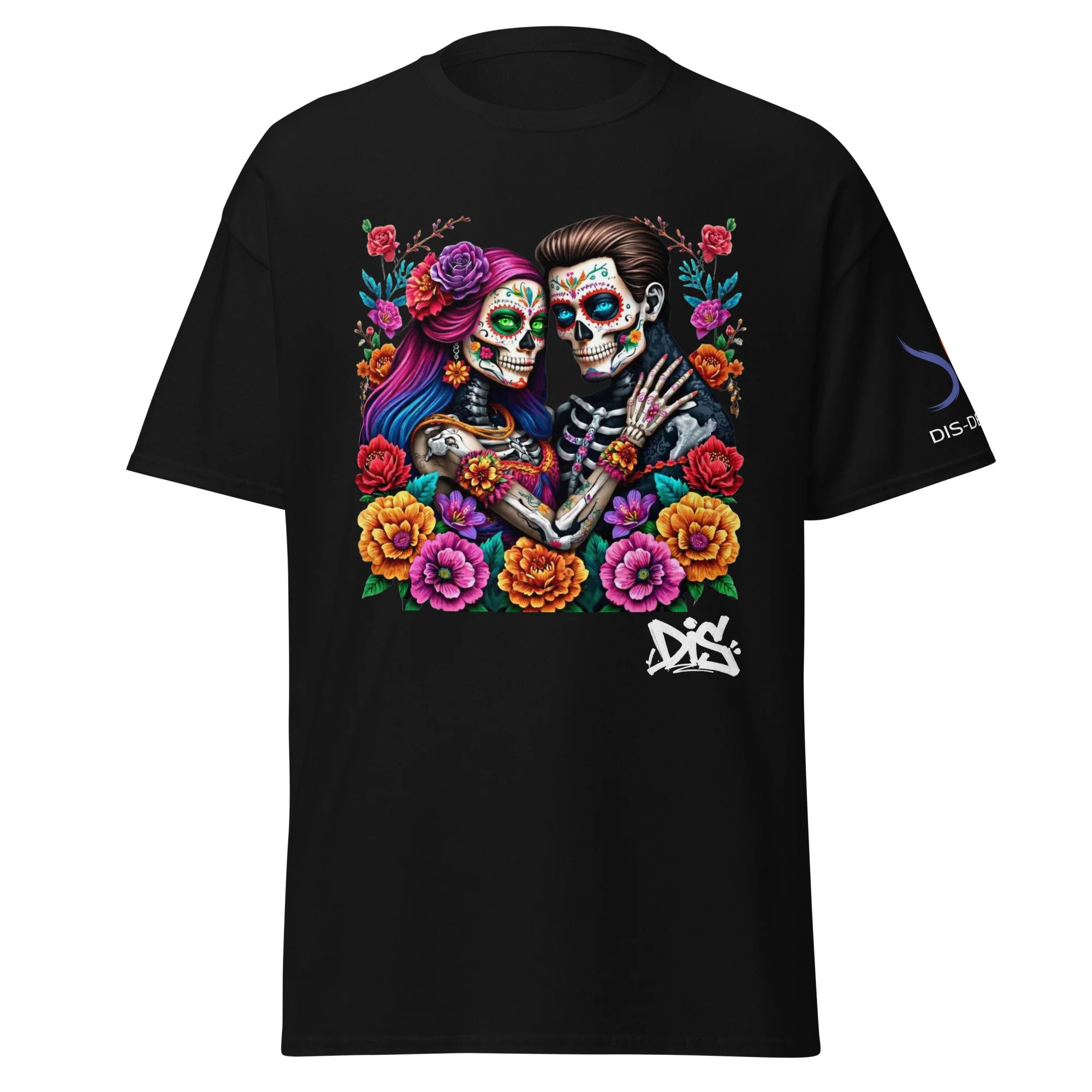 Das Design zeigt zwei kunstvoll gestaltete Día‑de‑los‑Muertos‑Skeletons in einer liebevollen Umarmung, verziert mit farbenprächtigen Blumen und traditionellen Sugar‑Skull‑Elementen. Die kräftigen Farben und feinen Details verleihen dem Shirt einen einzigartigen, künstlerischen Look.